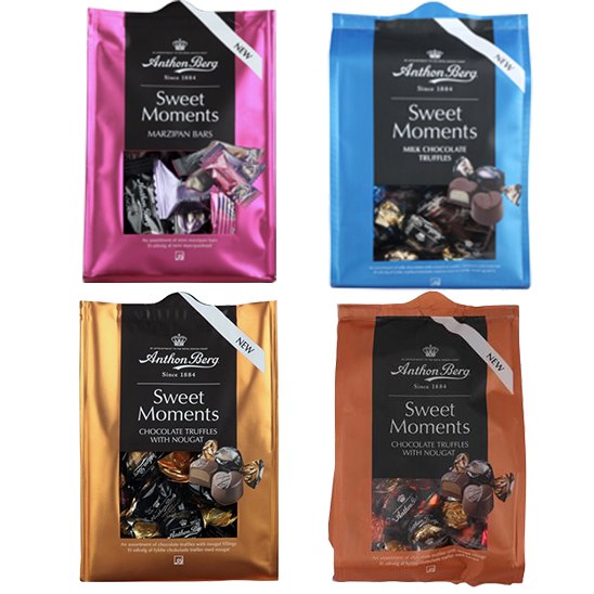 Har du endnu ikke fundet dine favorit Anthon Berg chokoladeprodukter, så kan du benytte de fire poser fra Sweet Moments-sortimentet til at udvælge disse. Selvom du ikke får alle produkter fra Anthon Berg, så kommer du rundt i hele udvalget, på den nemmeste, hurtigste og billigste måde.